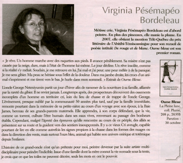 Mots clés : Virginia Pésémapéo Bordeleau, Ourse bleue, Livre, Culture, Montréal, Québec (province)