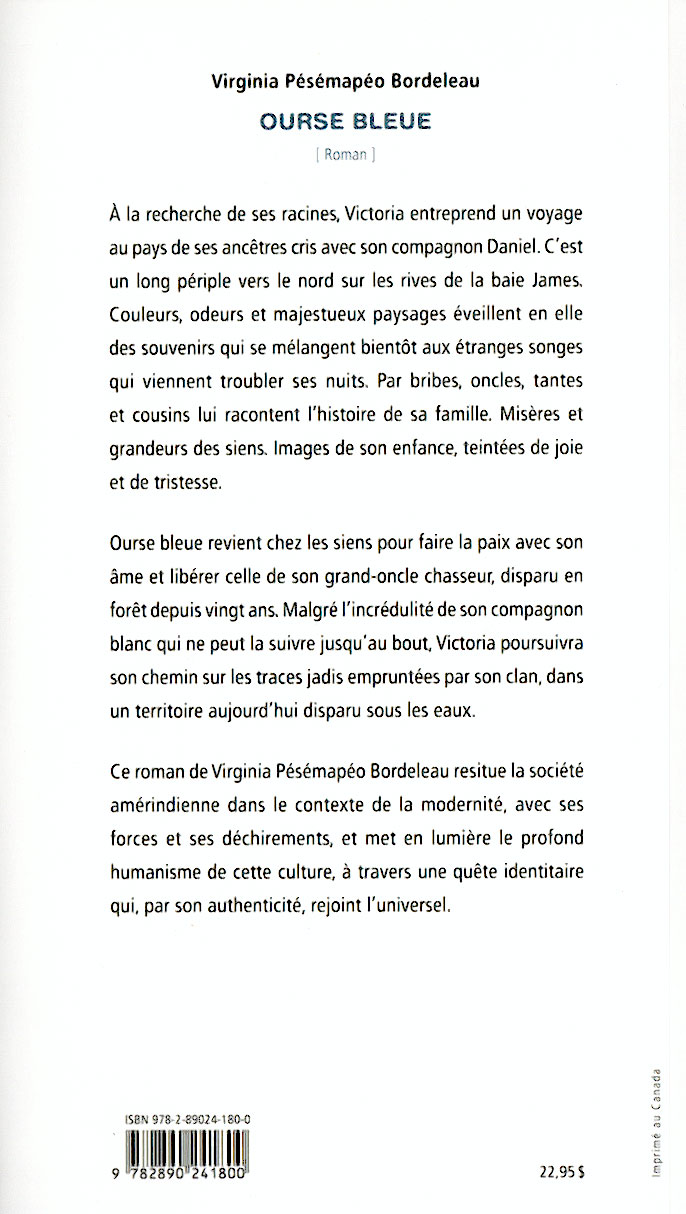 Une Métis. Née d'une mère crie, d'un père québécois. Qui se disputent à l'intérieur d'elle-même. Parviendra-t-elle un jour à réconcilier les deux cultures qui vibrent en elle? Ourse bleue raconte sa quête.